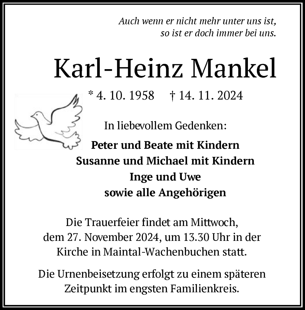 Hier finden Sie alle Traueranzeigen aus der Zeitung, die bisher für Karl-Heinz Mankel erschienen sind. Weitere Traueranzeigen, die in der Zeitung erscheinen, werden hier ebenfalls aufgelistet