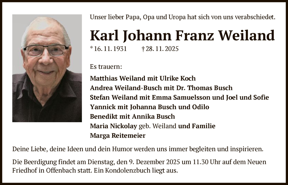Hier finden Sie alle Traueranzeigen aus der Zeitung, die bisher für Karl Johann Franz Weiland erschienen sind. Weitere Traueranzeigen, die in der Zeitung erscheinen, werden hier ebenfalls aufgelistet