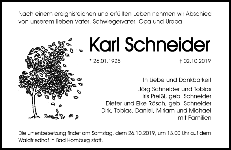 Hier finden Sie alle Traueranzeigen aus der Zeitung, die bisher für Karl Schneider erschienen sind. Weitere Traueranzeigen, die in der Zeitung erscheinen, werden hier ebenfalls aufgelistet