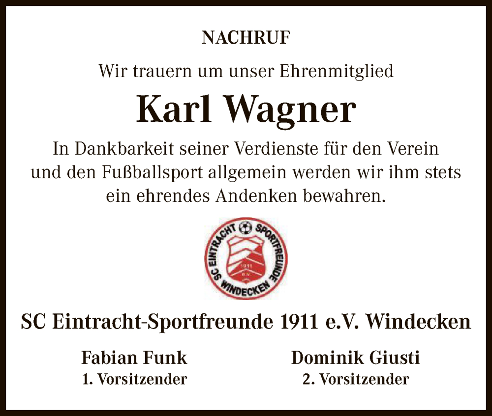 Hier finden Sie alle Traueranzeigen aus der Zeitung, die bisher für Karl Wagner erschienen sind. Weitere Traueranzeigen, die in der Zeitung erscheinen, werden hier ebenfalls aufgelistet