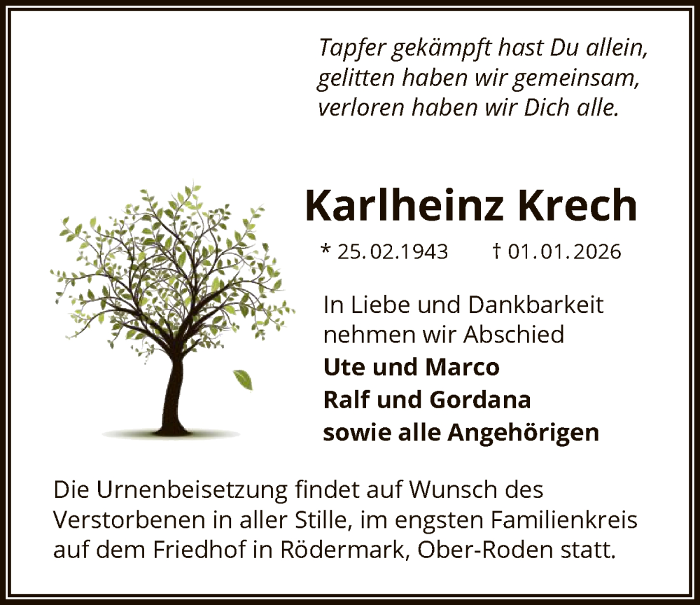 Hier finden Sie alle Traueranzeigen aus der Zeitung, die bisher für Karlheinz Krech erschienen sind. Weitere Traueranzeigen, die in der Zeitung erscheinen, werden hier ebenfalls aufgelistet