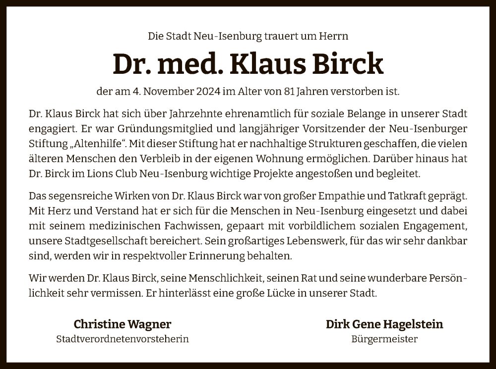 Hier finden Sie alle Traueranzeigen aus der Zeitung, die bisher für Klaus Birck erschienen sind. Weitere Traueranzeigen, die in der Zeitung erscheinen, werden hier ebenfalls aufgelistet