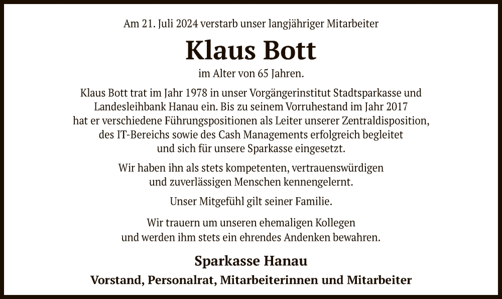 Hier finden Sie alle Traueranzeigen aus der Zeitung, die bisher für Klaus Bott erschienen sind. Weitere Traueranzeigen, die in der Zeitung erscheinen, werden hier ebenfalls aufgelistet