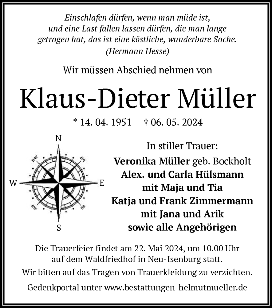 Hier finden Sie alle Traueranzeigen aus der Zeitung, die bisher für Klaus-Dieter Müller erschienen sind. Weitere Traueranzeigen, die in der Zeitung erscheinen, werden hier ebenfalls aufgelistet