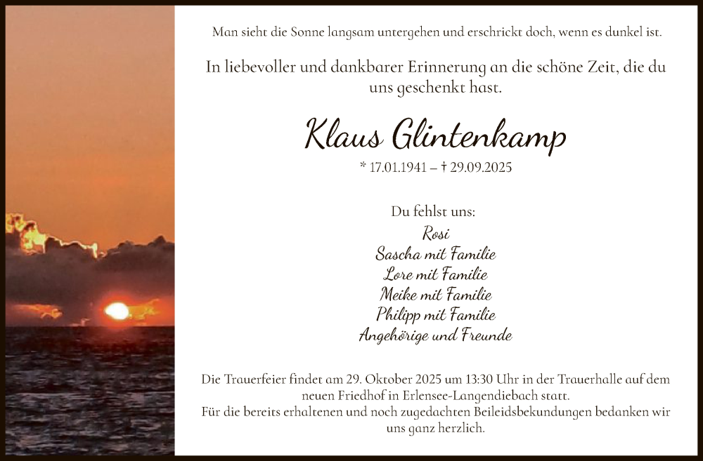 Hier finden Sie alle Traueranzeigen aus der Zeitung, die bisher für Klaus Glintenkamp erschienen sind. Weitere Traueranzeigen, die in der Zeitung erscheinen, werden hier ebenfalls aufgelistet