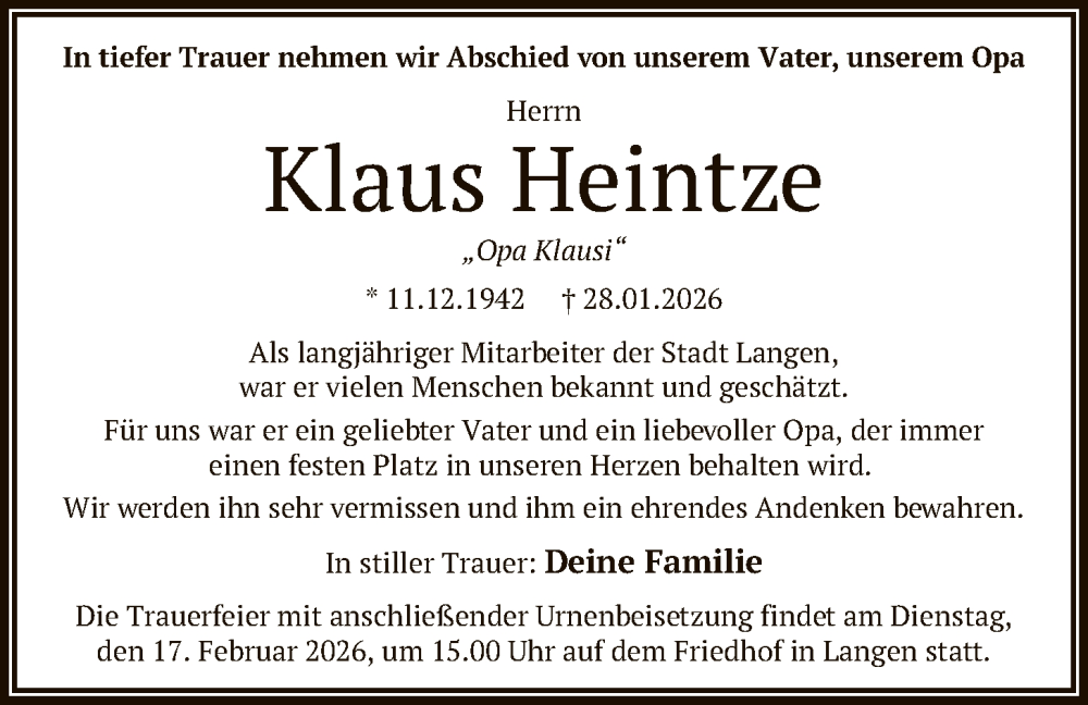 Hier finden Sie alle Traueranzeigen aus der Zeitung, die bisher für Klaus Heintze erschienen sind. Weitere Traueranzeigen, die in der Zeitung erscheinen, werden hier ebenfalls aufgelistet