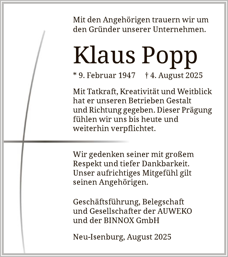 Hier finden Sie alle Traueranzeigen aus der Zeitung, die bisher für Klaus Popp erschienen sind. Weitere Traueranzeigen, die in der Zeitung erscheinen, werden hier ebenfalls aufgelistet