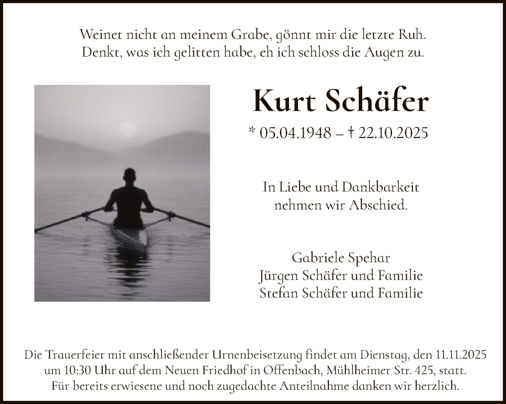 Hier finden Sie alle Traueranzeigen aus der Zeitung, die bisher für Kurt Schäfer erschienen sind. Weitere Traueranzeigen, die in der Zeitung erscheinen, werden hier ebenfalls aufgelistet