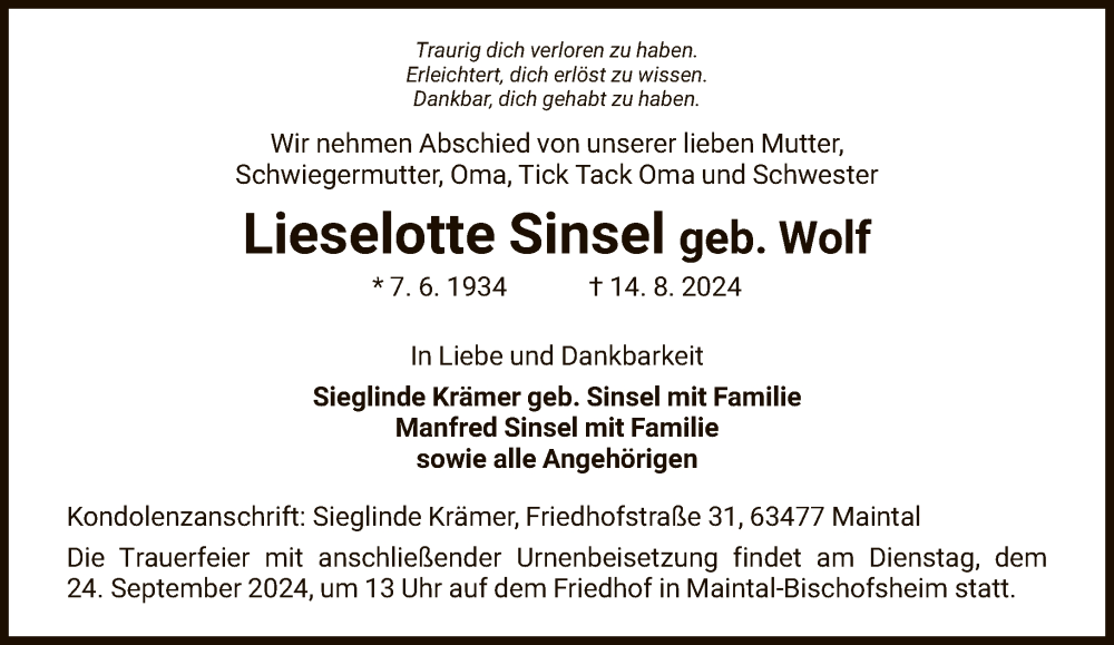 Hier finden Sie alle Traueranzeigen aus der Zeitung, die bisher für Lieselotte Sinsel erschienen sind. Weitere Traueranzeigen, die in der Zeitung erscheinen, werden hier ebenfalls aufgelistet