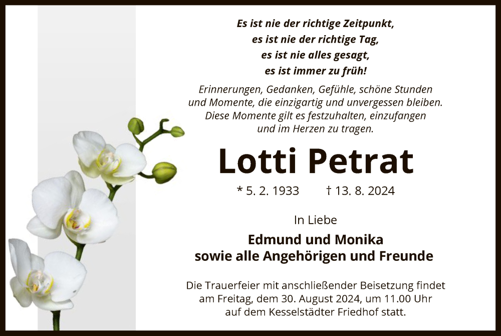 Hier finden Sie alle Traueranzeigen aus der Zeitung, die bisher für Lotti Petrat erschienen sind. Weitere Traueranzeigen, die in der Zeitung erscheinen, werden hier ebenfalls aufgelistet