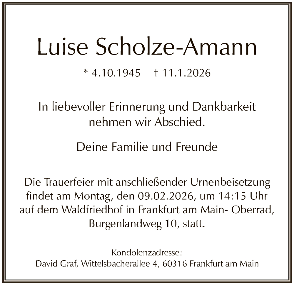 Hier finden Sie alle Traueranzeigen aus der Zeitung, die bisher für Luise Scholze-Amann erschienen sind. Weitere Traueranzeigen, die in der Zeitung erscheinen, werden hier ebenfalls aufgelistet