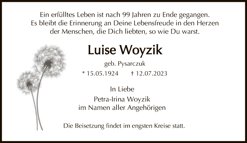 Hier finden Sie alle Traueranzeigen aus der Zeitung, die bisher für Luise Woyzik erschienen sind. Weitere Traueranzeigen, die in der Zeitung erscheinen, werden hier ebenfalls aufgelistet