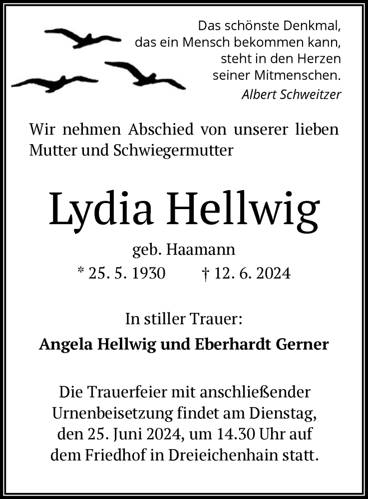 Hier finden Sie alle Traueranzeigen aus der Zeitung, die bisher für Lydia Hellwig erschienen sind. Weitere Traueranzeigen, die in der Zeitung erscheinen, werden hier ebenfalls aufgelistet