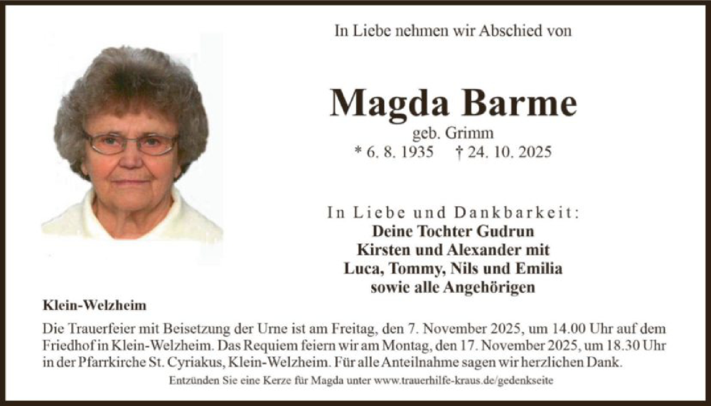 Hier finden Sie alle Traueranzeigen aus der Zeitung, die bisher für Magda Barme erschienen sind. Weitere Traueranzeigen, die in der Zeitung erscheinen, werden hier ebenfalls aufgelistet