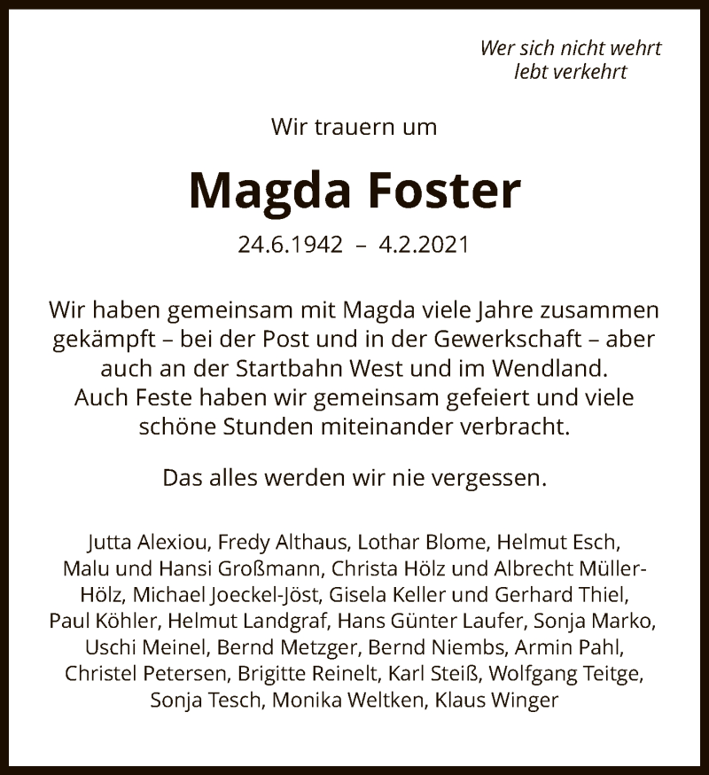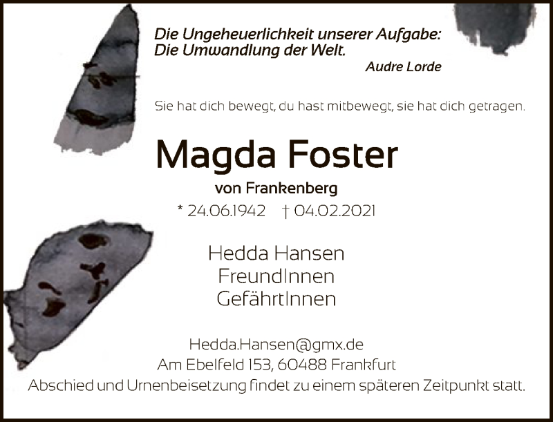 Hier finden Sie alle Traueranzeigen aus der Zeitung, die bisher für Magda Foster erschienen sind. Weitere Traueranzeigen, die in der Zeitung erscheinen, werden hier ebenfalls aufgelistet