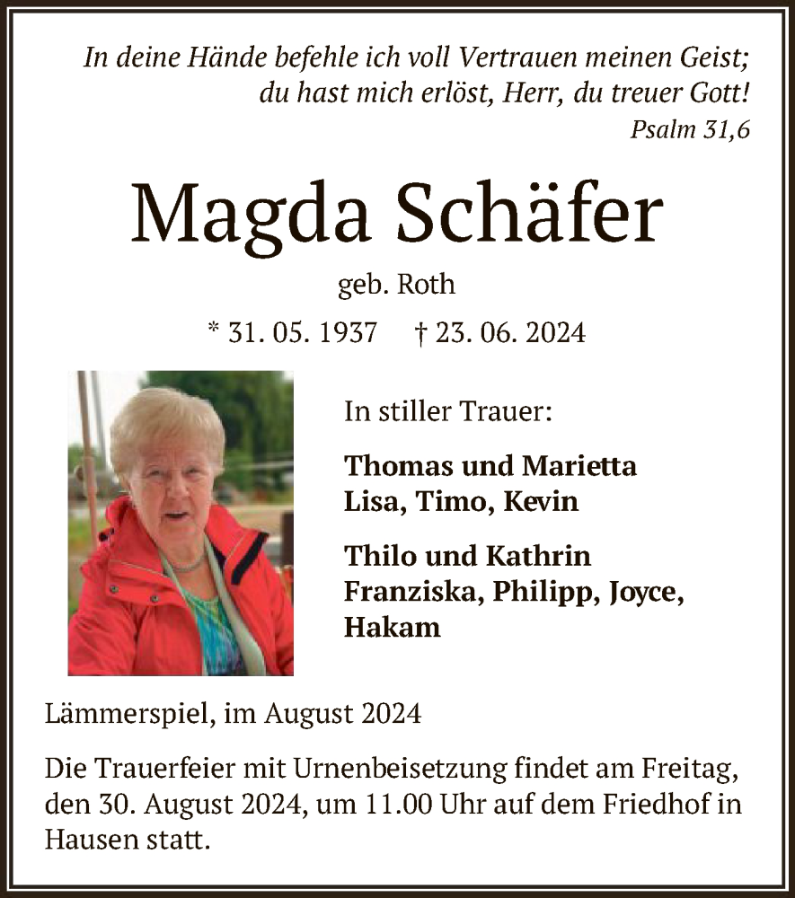 Hier finden Sie alle Traueranzeigen aus der Zeitung, die bisher für Magda Schäfer erschienen sind. Weitere Traueranzeigen, die in der Zeitung erscheinen, werden hier ebenfalls aufgelistet