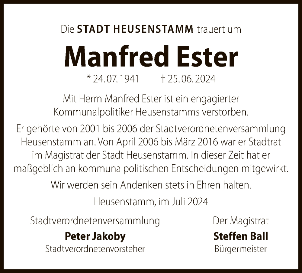 Hier finden Sie alle Traueranzeigen aus der Zeitung, die bisher für Manfred Ester erschienen sind. Weitere Traueranzeigen, die in der Zeitung erscheinen, werden hier ebenfalls aufgelistet