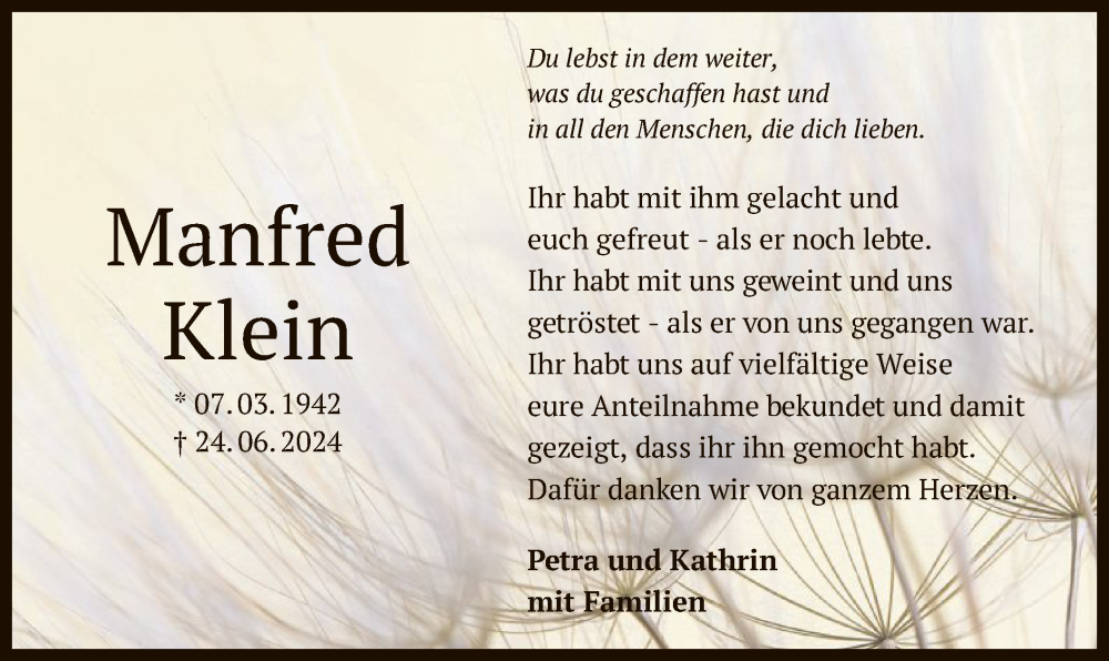 Hier finden Sie alle Traueranzeigen aus der Zeitung, die bisher für Manfred Klein erschienen sind. Weitere Traueranzeigen, die in der Zeitung erscheinen, werden hier ebenfalls aufgelistet