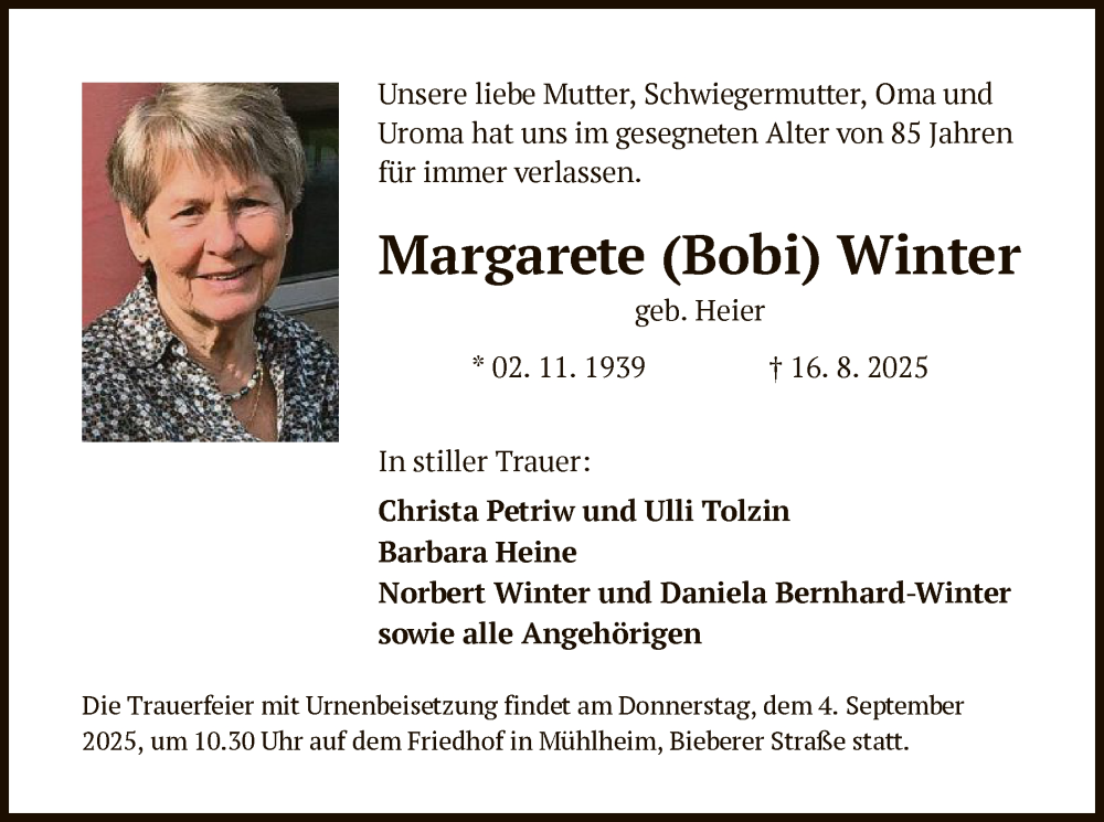 Hier finden Sie alle Traueranzeigen aus der Zeitung, die bisher für Margarete Winter erschienen sind. Weitere Traueranzeigen, die in der Zeitung erscheinen, werden hier ebenfalls aufgelistet