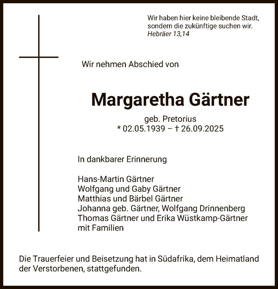 Hier finden Sie alle Traueranzeigen aus der Zeitung, die bisher für Margaretha Gärtner erschienen sind. Weitere Traueranzeigen, die in der Zeitung erscheinen, werden hier ebenfalls aufgelistet