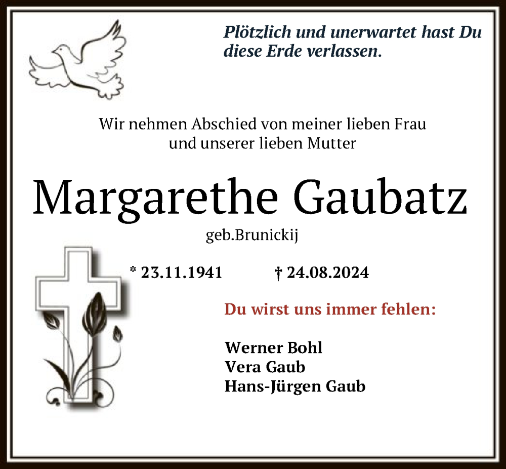 Hier finden Sie alle Traueranzeigen aus der Zeitung, die bisher für Margarethe Gaubatz erschienen sind. Weitere Traueranzeigen, die in der Zeitung erscheinen, werden hier ebenfalls aufgelistet