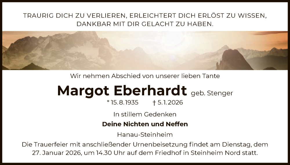 Hier finden Sie alle Traueranzeigen aus der Zeitung, die bisher für Margot Eberhardt erschienen sind. Weitere Traueranzeigen, die in der Zeitung erscheinen, werden hier ebenfalls aufgelistet