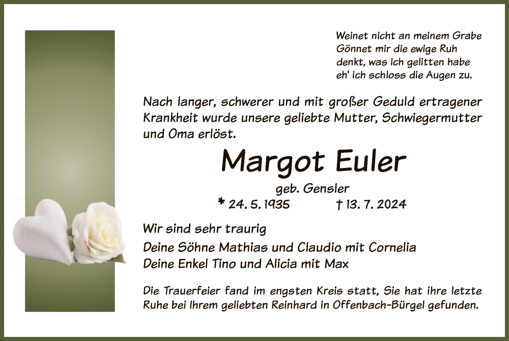 Hier finden Sie alle Traueranzeigen aus der Zeitung, die bisher für Margot Euler erschienen sind. Weitere Traueranzeigen, die in der Zeitung erscheinen, werden hier ebenfalls aufgelistet