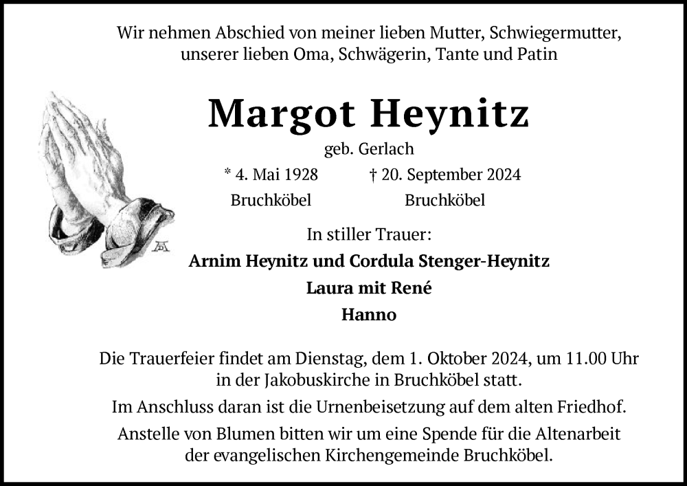 Hier finden Sie alle Traueranzeigen aus der Zeitung, die bisher für Margot Heynitz erschienen sind. Weitere Traueranzeigen, die in der Zeitung erscheinen, werden hier ebenfalls aufgelistet