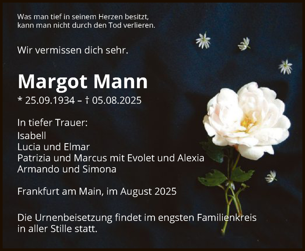 Hier finden Sie alle Traueranzeigen aus der Zeitung, die bisher für Margot Mann erschienen sind. Weitere Traueranzeigen, die in der Zeitung erscheinen, werden hier ebenfalls aufgelistet