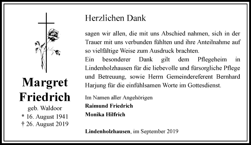 Hier finden Sie alle Traueranzeigen aus der Zeitung, die bisher für Margret Friedrich erschienen sind. Weitere Traueranzeigen, die in der Zeitung erscheinen, werden hier ebenfalls aufgelistet
