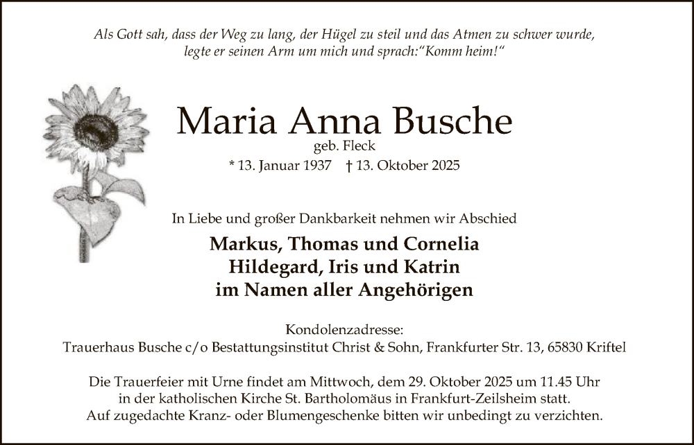Hier finden Sie alle Traueranzeigen aus der Zeitung, die bisher für Maria Anna Busche erschienen sind. Weitere Traueranzeigen, die in der Zeitung erscheinen, werden hier ebenfalls aufgelistet