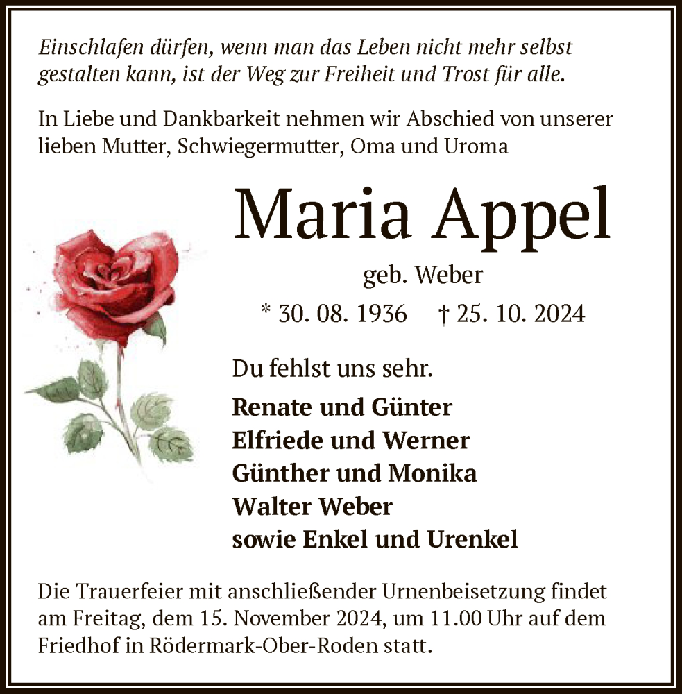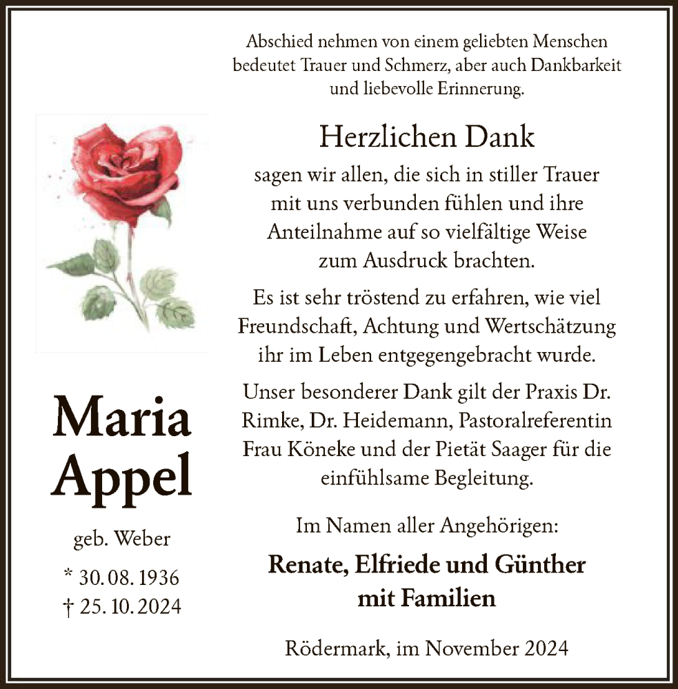 Hier finden Sie alle Traueranzeigen aus der Zeitung, die bisher für Maria Appel erschienen sind. Weitere Traueranzeigen, die in der Zeitung erscheinen, werden hier ebenfalls aufgelistet
