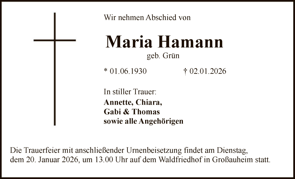 Hier finden Sie alle Traueranzeigen aus der Zeitung, die bisher für Maria Hamann erschienen sind. Weitere Traueranzeigen, die in der Zeitung erscheinen, werden hier ebenfalls aufgelistet