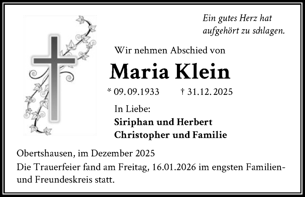 Hier finden Sie alle Traueranzeigen aus der Zeitung, die bisher für Maria Klein erschienen sind. Weitere Traueranzeigen, die in der Zeitung erscheinen, werden hier ebenfalls aufgelistet