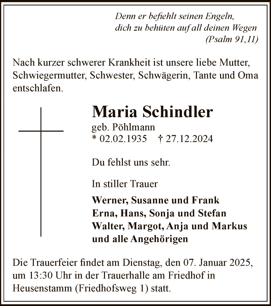 Hier finden Sie alle Traueranzeigen aus der Zeitung, die bisher für Maria Schindler erschienen sind. Weitere Traueranzeigen, die in der Zeitung erscheinen, werden hier ebenfalls aufgelistet