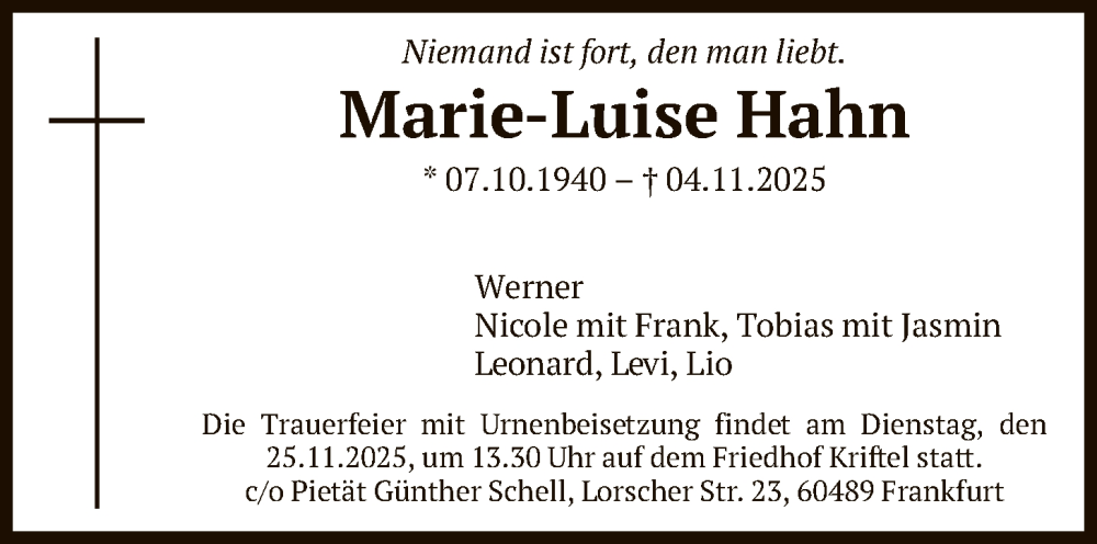 Hier finden Sie alle Traueranzeigen aus der Zeitung, die bisher für Marie-Luise Hahn erschienen sind. Weitere Traueranzeigen, die in der Zeitung erscheinen, werden hier ebenfalls aufgelistet