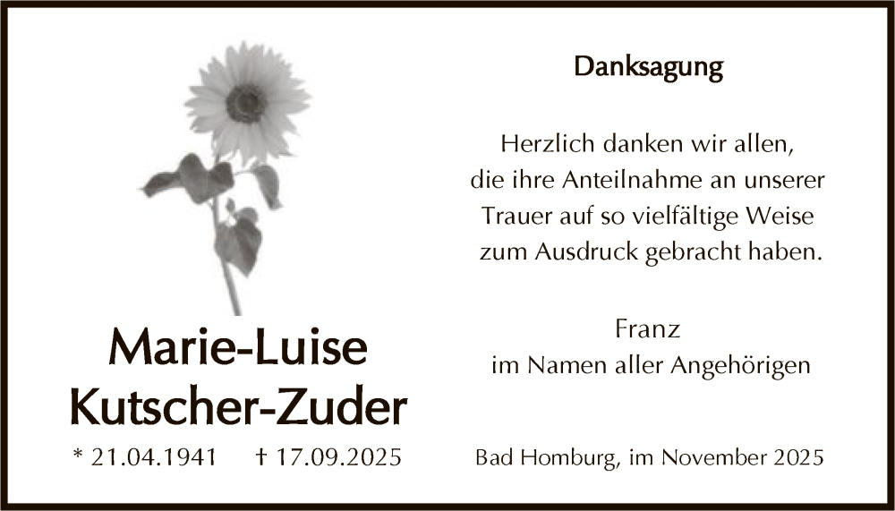 Hier finden Sie alle Traueranzeigen aus der Zeitung, die bisher für Marie-Luise Kutscher-Zuder erschienen sind. Weitere Traueranzeigen, die in der Zeitung erscheinen, werden hier ebenfalls aufgelistet