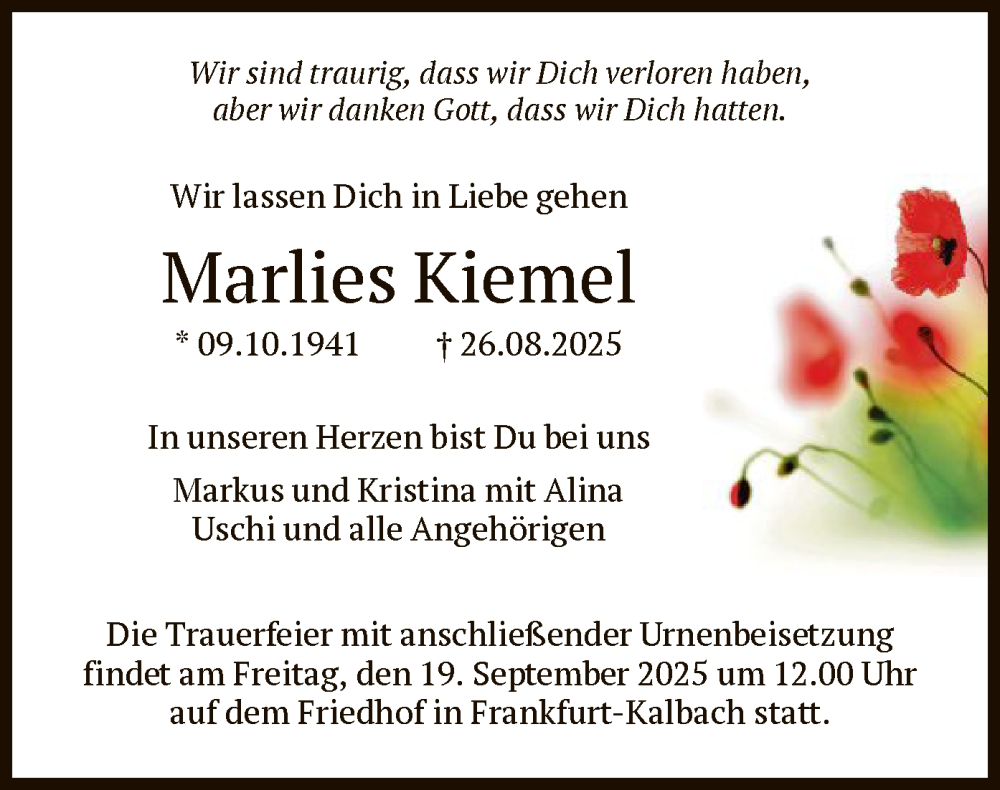 Hier finden Sie alle Traueranzeigen aus der Zeitung, die bisher für Marlies Kiemel erschienen sind. Weitere Traueranzeigen, die in der Zeitung erscheinen, werden hier ebenfalls aufgelistet