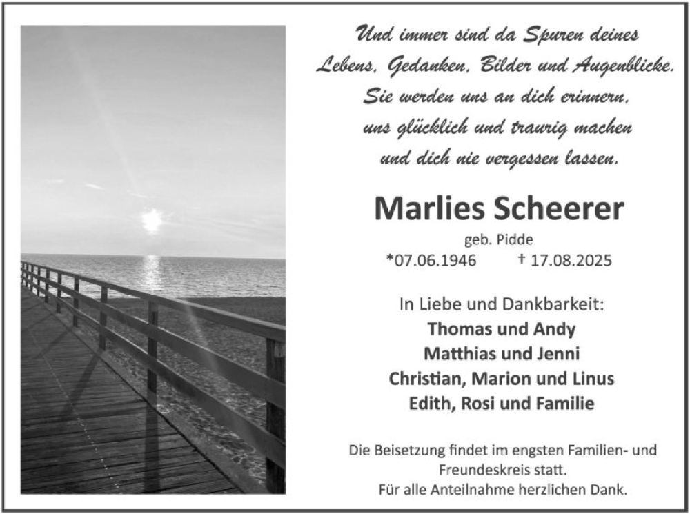 Hier finden Sie alle Traueranzeigen aus der Zeitung, die bisher für Marlies Scheerer erschienen sind. Weitere Traueranzeigen, die in der Zeitung erscheinen, werden hier ebenfalls aufgelistet