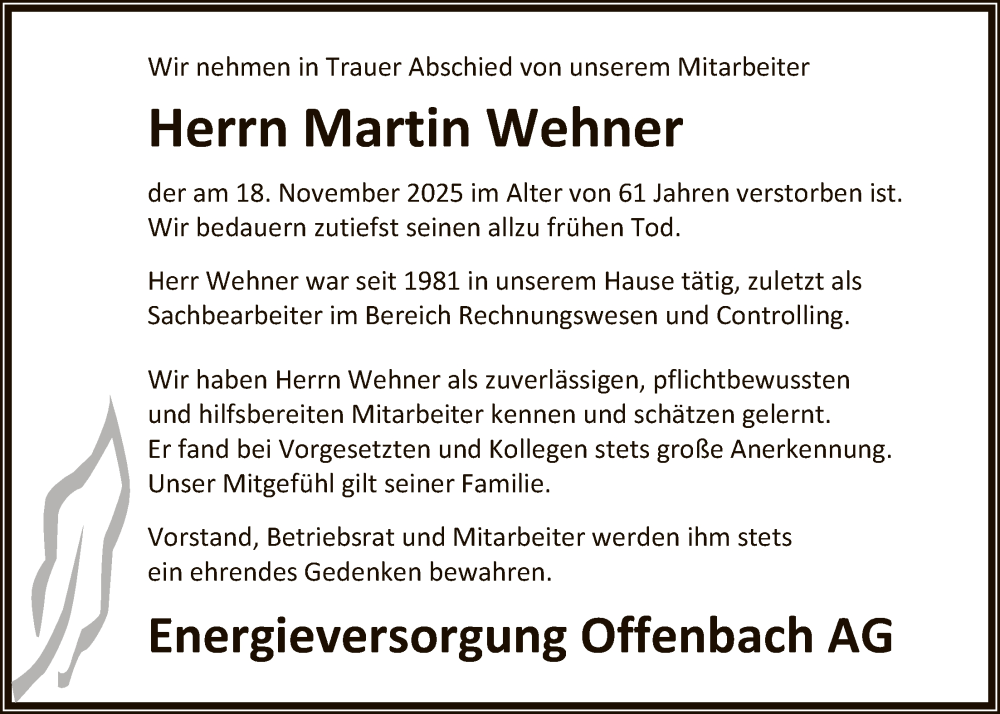 Hier finden Sie alle Traueranzeigen aus der Zeitung, die bisher für Martin Wehner erschienen sind. Weitere Traueranzeigen, die in der Zeitung erscheinen, werden hier ebenfalls aufgelistet