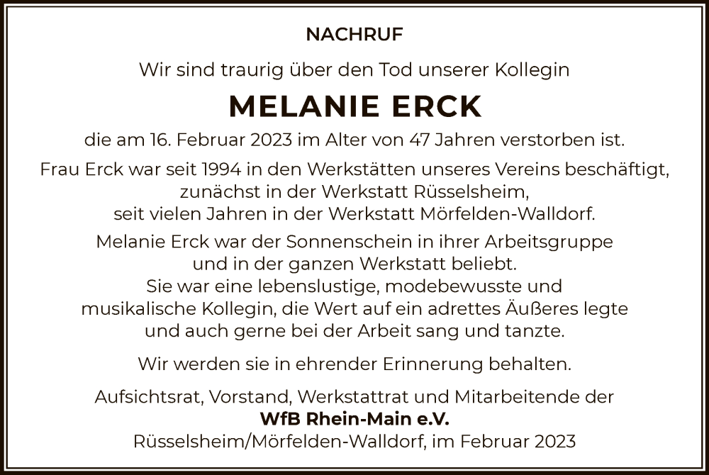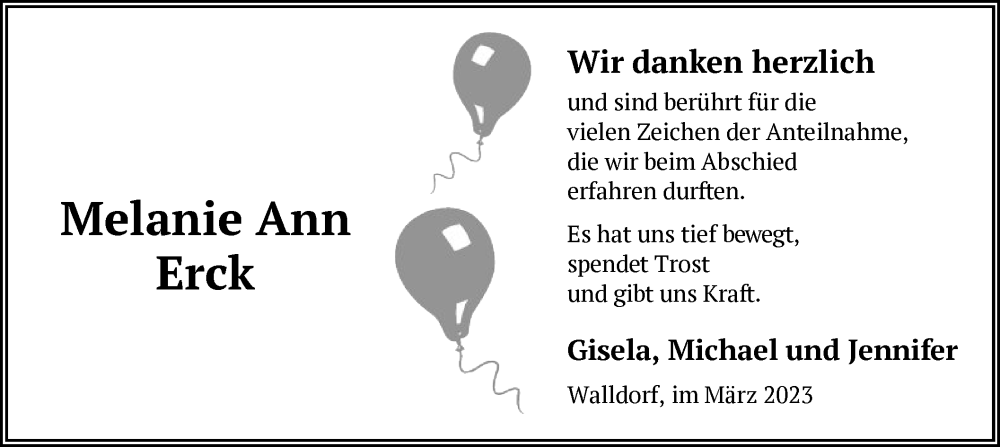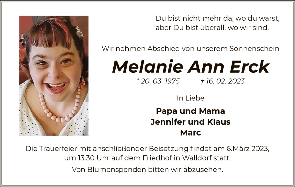 Hier finden Sie alle Traueranzeigen aus der Zeitung, die bisher für Melanie Ann Erck erschienen sind. Weitere Traueranzeigen, die in der Zeitung erscheinen, werden hier ebenfalls aufgelistet