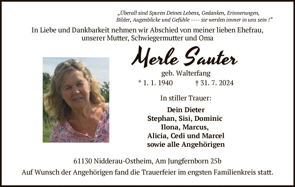 Hier finden Sie alle Traueranzeigen aus der Zeitung, die bisher für Merle Sauter erschienen sind. Weitere Traueranzeigen, die in der Zeitung erscheinen, werden hier ebenfalls aufgelistet