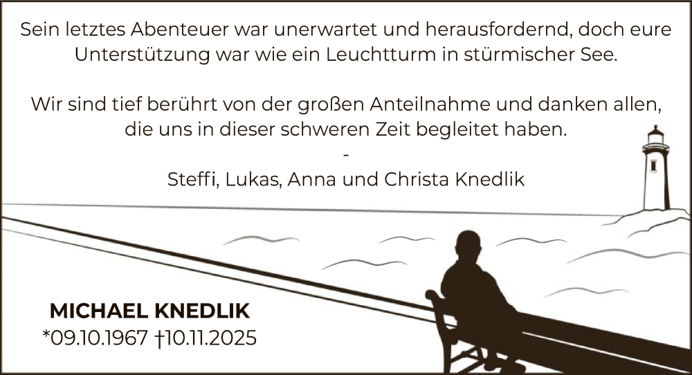 Hier finden Sie alle Traueranzeigen aus der Zeitung, die bisher für Michael Knedlik erschienen sind. Weitere Traueranzeigen, die in der Zeitung erscheinen, werden hier ebenfalls aufgelistet