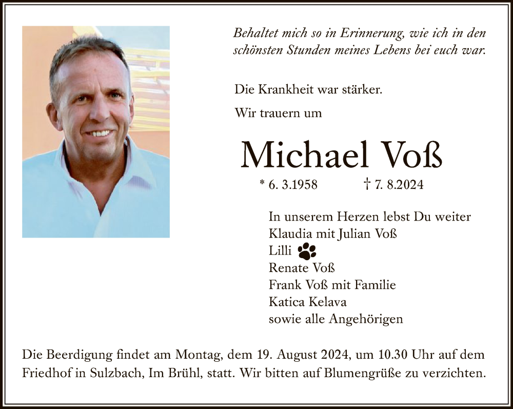 Hier finden Sie alle Traueranzeigen aus der Zeitung, die bisher für Michael Voß erschienen sind. Weitere Traueranzeigen, die in der Zeitung erscheinen, werden hier ebenfalls aufgelistet