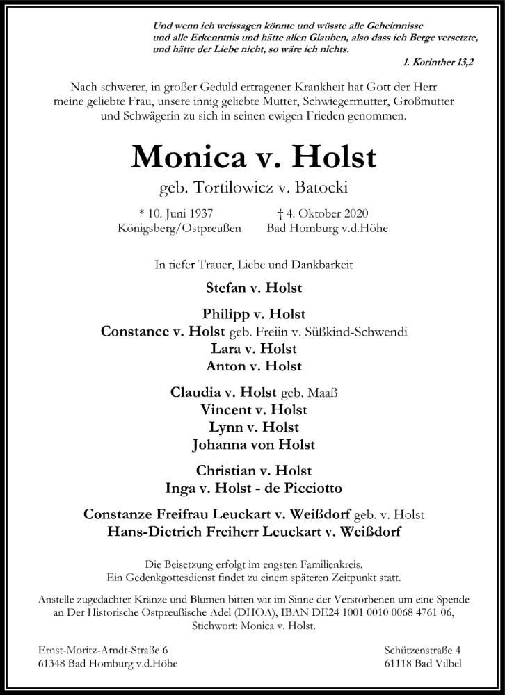 Hier finden Sie alle Traueranzeigen aus der Zeitung, die bisher für Monica v. Holst erschienen sind. Weitere Traueranzeigen, die in der Zeitung erscheinen, werden hier ebenfalls aufgelistet