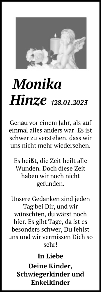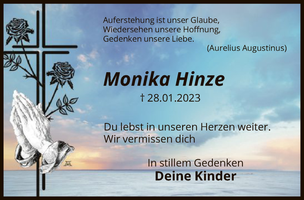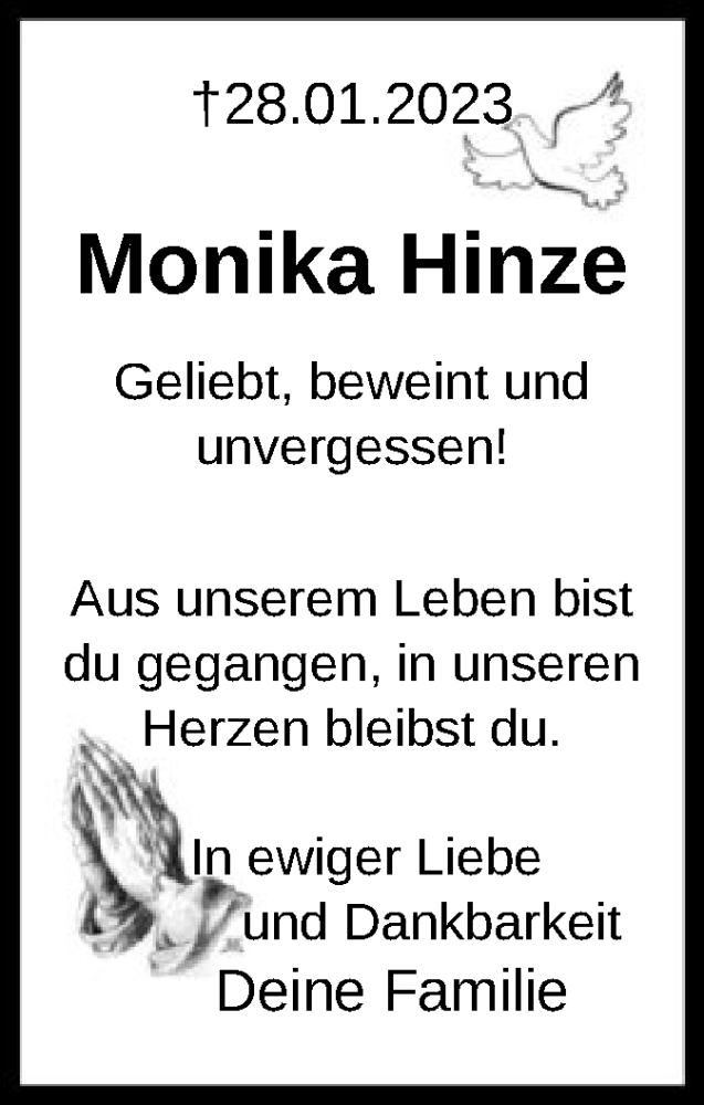 Hier finden Sie alle Traueranzeigen aus der Zeitung, die bisher für Monika Hinze erschienen sind. Weitere Traueranzeigen, die in der Zeitung erscheinen, werden hier ebenfalls aufgelistet