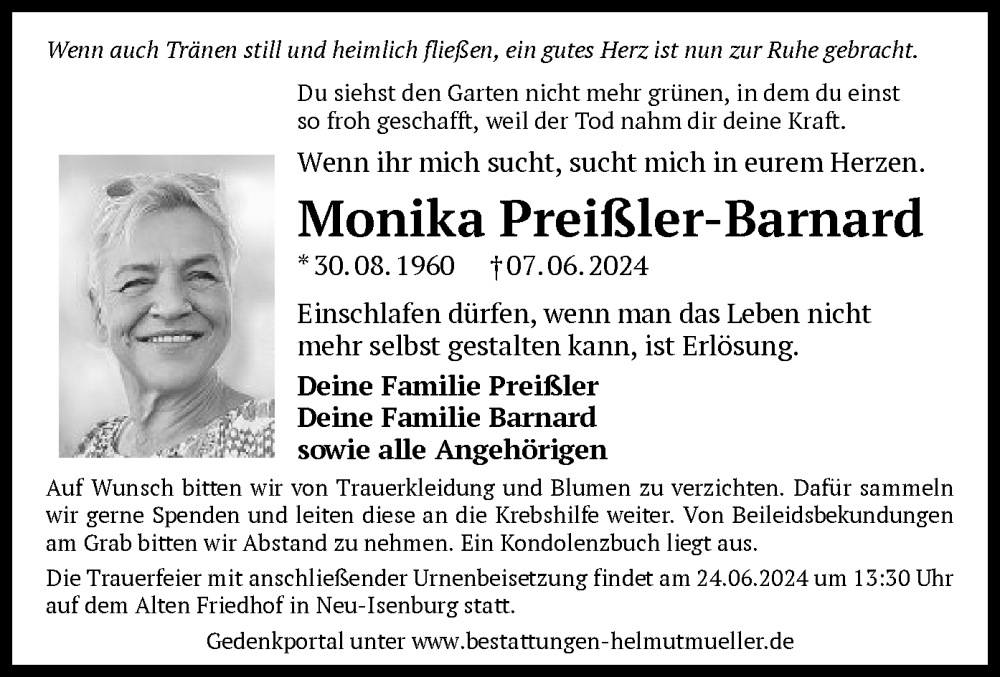 Hier finden Sie alle Traueranzeigen aus der Zeitung, die bisher für Monika Preißler-Barnard erschienen sind. Weitere Traueranzeigen, die in der Zeitung erscheinen, werden hier ebenfalls aufgelistet