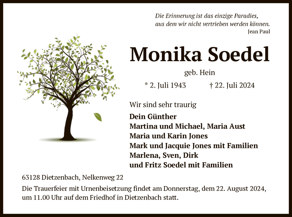Hier finden Sie alle Traueranzeigen aus der Zeitung, die bisher für Monika Soedel erschienen sind. Weitere Traueranzeigen, die in der Zeitung erscheinen, werden hier ebenfalls aufgelistet