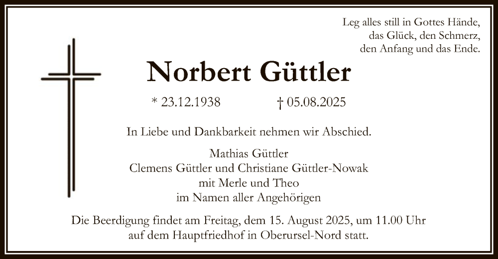 Hier finden Sie alle Traueranzeigen aus der Zeitung, die bisher für Norbert Güttler erschienen sind. Weitere Traueranzeigen, die in der Zeitung erscheinen, werden hier ebenfalls aufgelistet