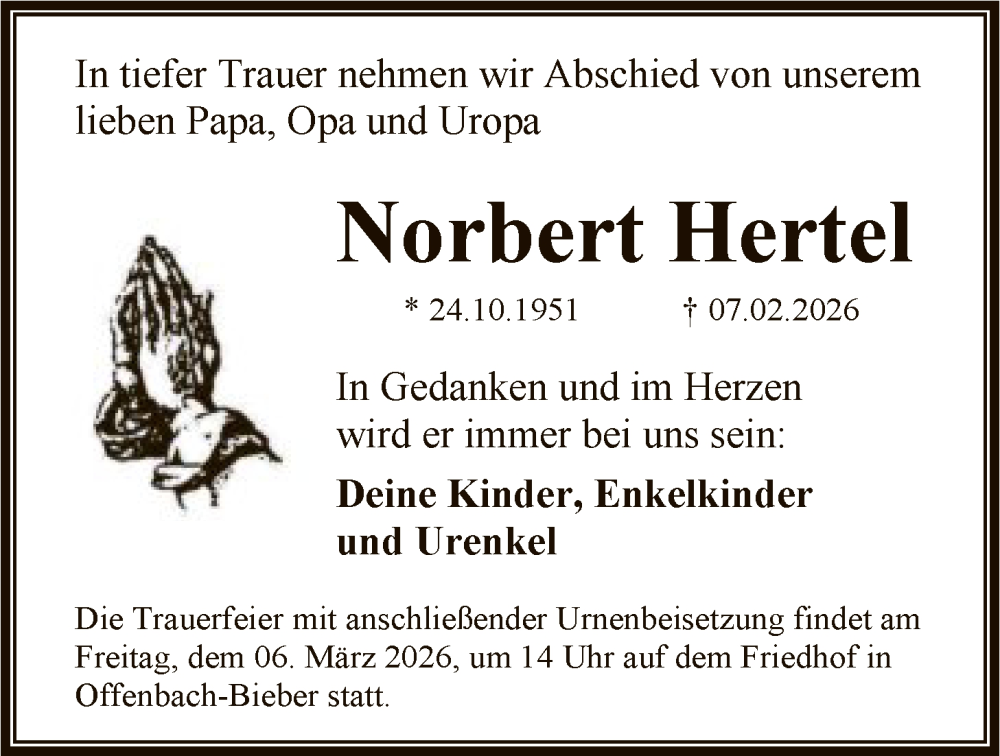 Hier finden Sie alle Traueranzeigen aus der Zeitung, die bisher für Norbert Hertel erschienen sind. Weitere Traueranzeigen, die in der Zeitung erscheinen, werden hier ebenfalls aufgelistet